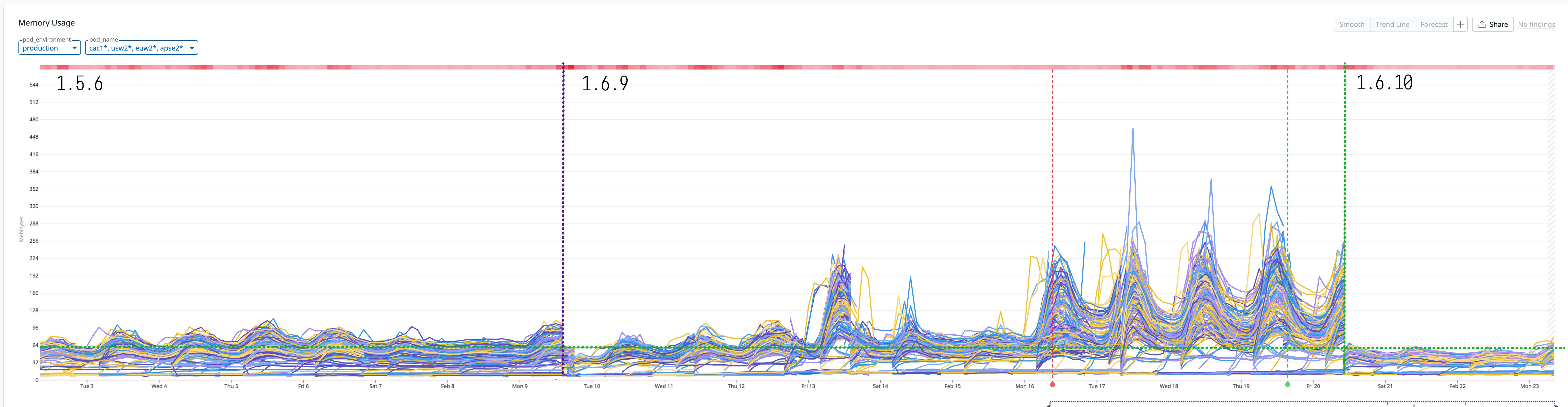 This release reduced AnyCable memory footprint and improved handling of large broadcast messages. Here is an example chart from one of our users: 🔥. Time to upgrade!